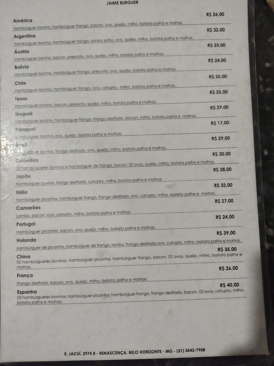 Welcome to Jaime Burguer Ltda, a hidden gem located at R. Jacui, 2974B in Belo Horizonte, MG. This vibrant burger joint has quickly established a reputation for serving delectable burgers that are as hearty in flavor as they are generous in size.